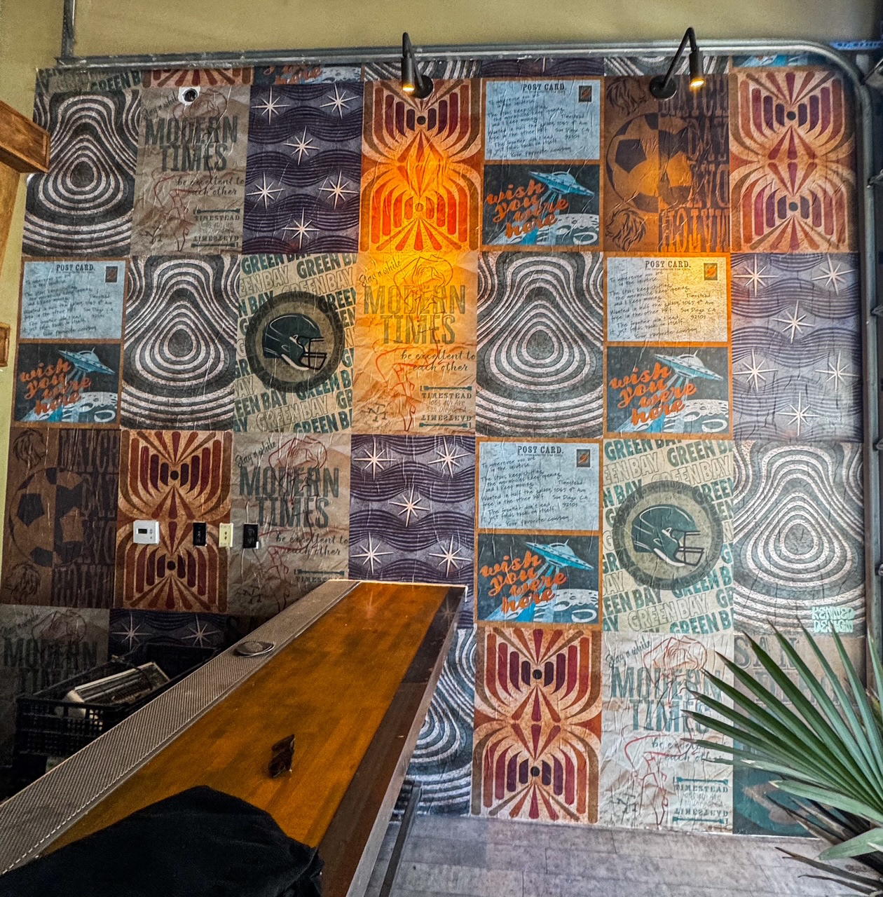 This mural combines the galactic theme of the space with the urban character of it's surroundings. Inspired by a space cowboy coming home. Using the textured, layered aesthetic of a wheat-paste poster installation, I incorporated imagery from vintage Modern Times can designs alongside visual elements inspired by the bar itself, creating a dynamic, site-specific narrative that bridges city streets and cosmic imagination.